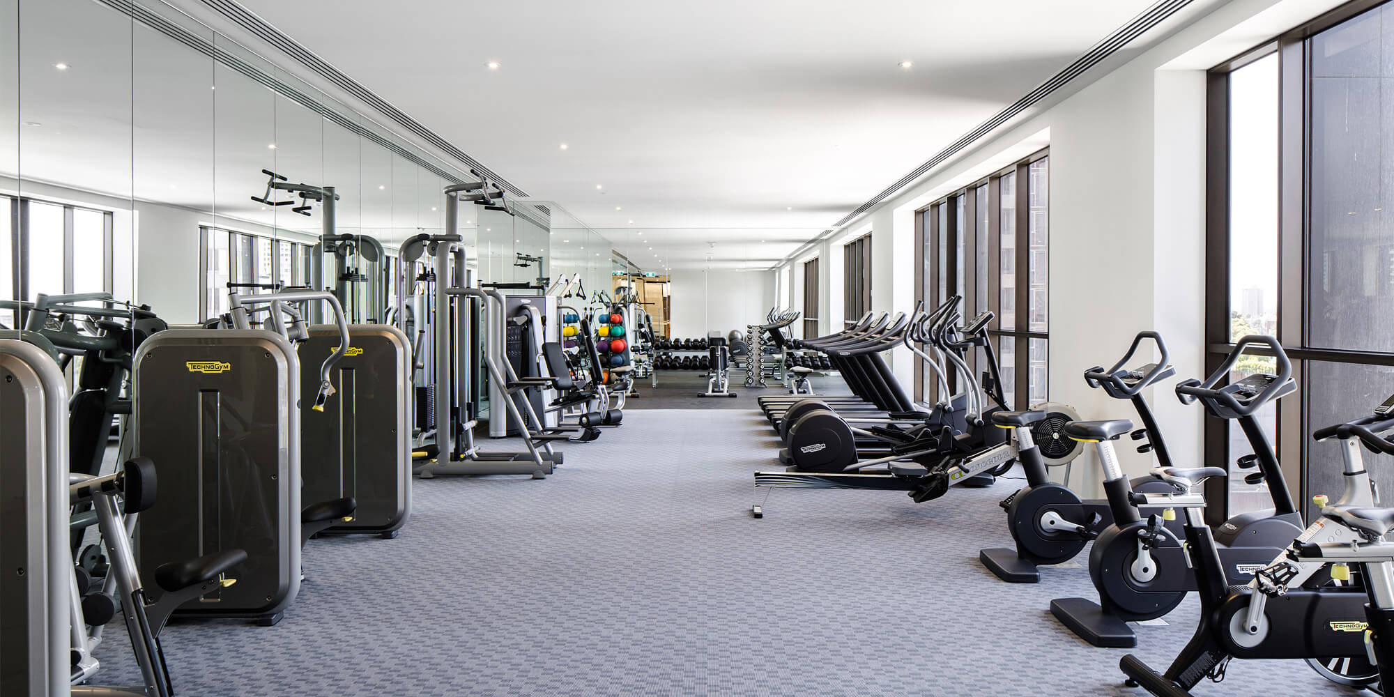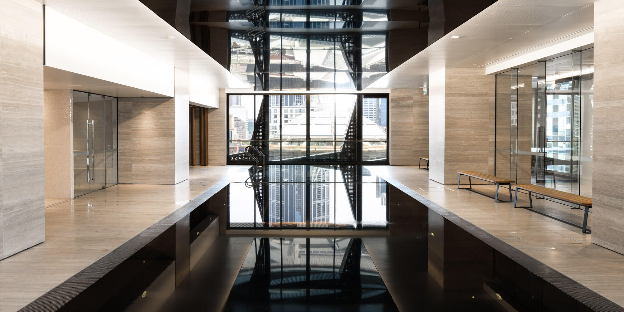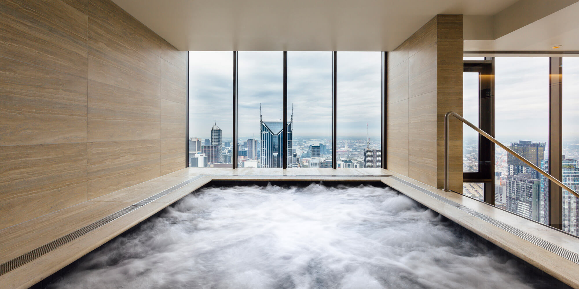 The 55th floor Sky Lounge features exclusive and luxurious spaces for respite and dining, complemented by gymnasium and day spa facilities overlooking the city and surrounds from all directions.