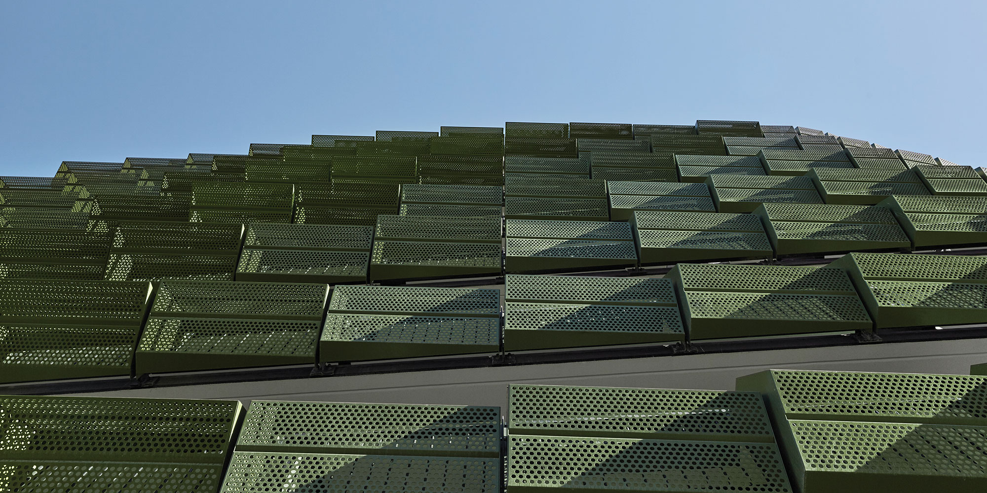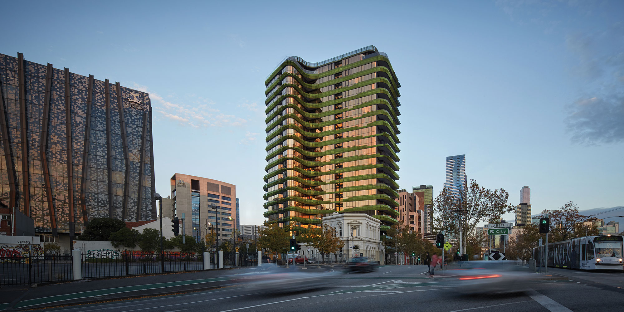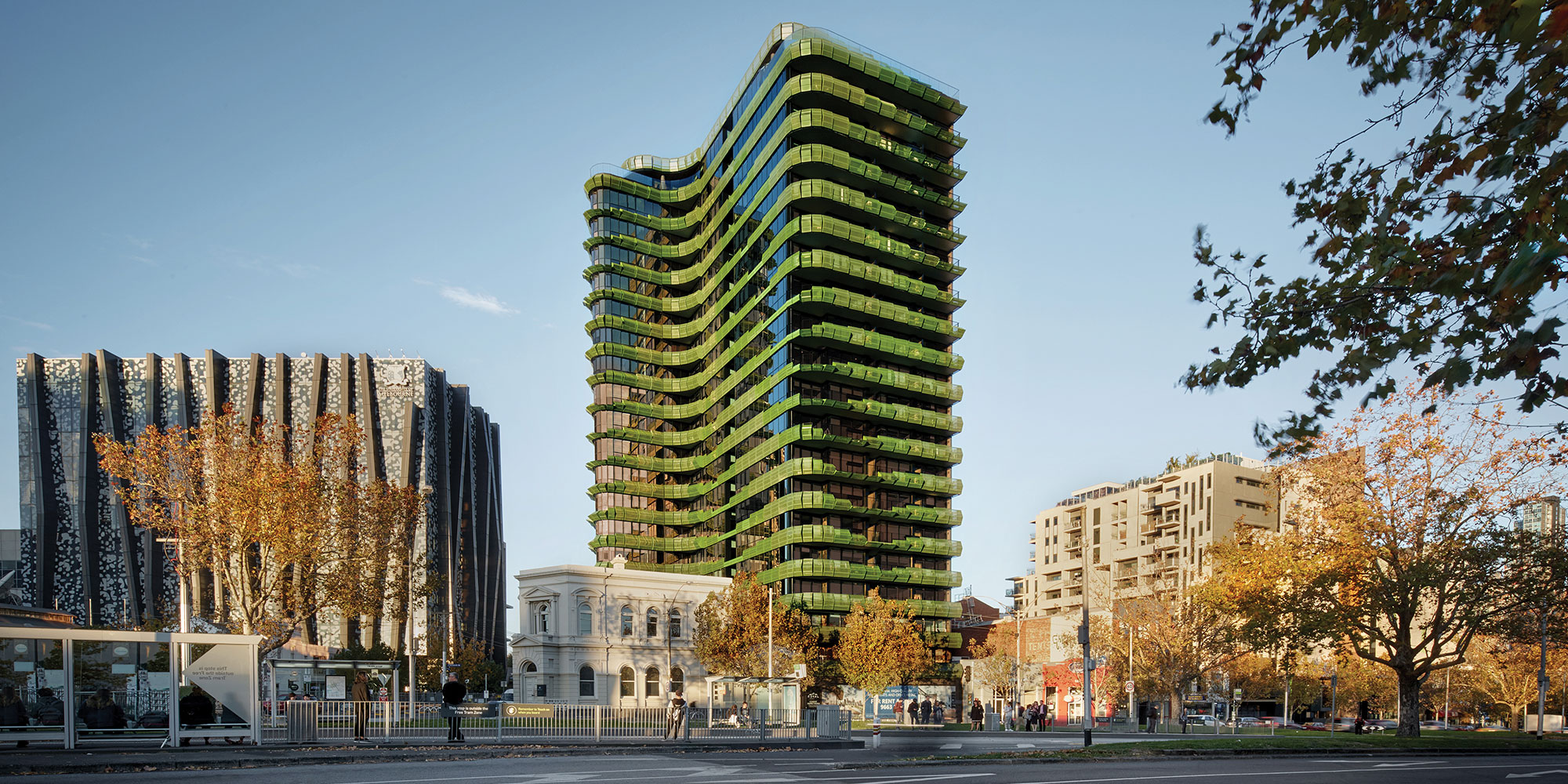 The tower was inspired by the quintessentially Australian gum trees lining Royal Parade and nearby Royal Park. Shimmering bronze glazing forms the trunk while perforated green balustrading in various shapes and shades serves as the tree’s foliage.