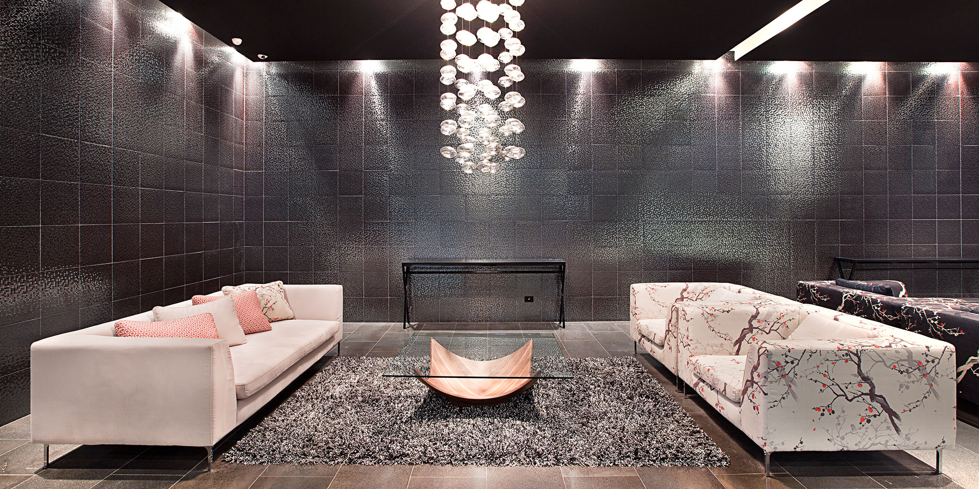An Eastern aesthetic is present in both the exteriors and interiors. An intricate gold pattern wraps the podium, bamboo and lighting installations highlight the lobby and the colour red was widely used for interior styling.